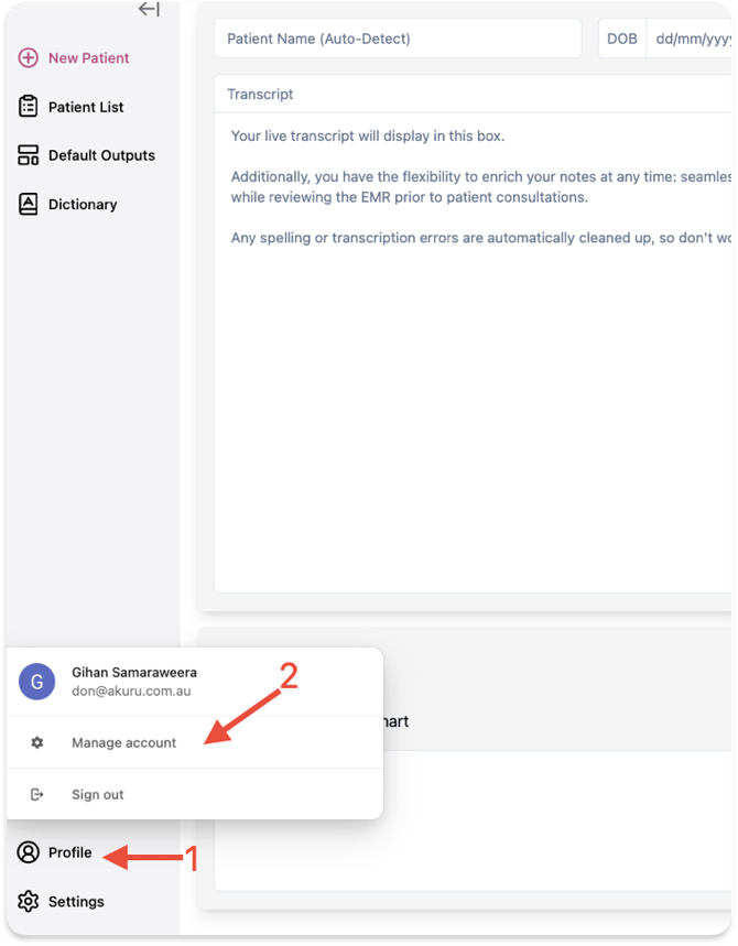 Click Manage Account from the dropdown menu (arrow #2 in the image below).