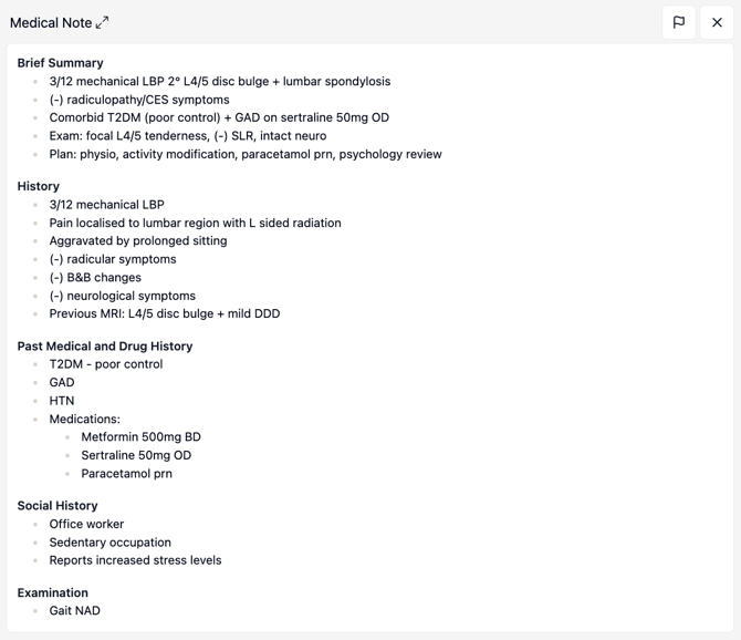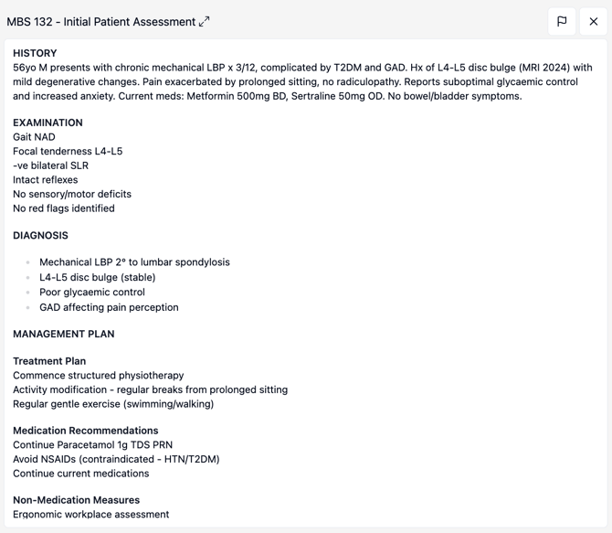 However, the physician said the above Medical Note format didn't work for all patients and some patient's required a "MBS 132 - Initial Patient Assessment". The physician provided i-scribe with a couple of factitious, ideal, example letters (and other information about the structuring of this document).