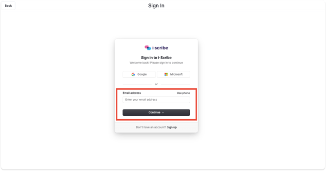 1. At log-in, enter your email address and click "Continue" (shown with red box below):